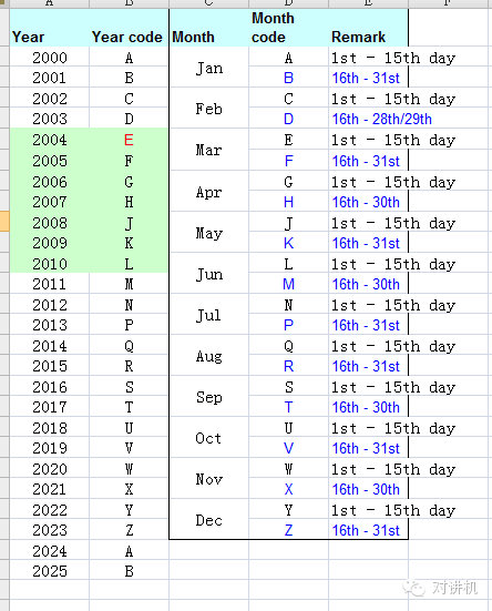 解释一下串号S/N码的含义:前三位037为设备号,第四位T为产地,第五位M为生产年费代码,第六位S为生产月份代码,后四位W112为序列号,今天重点说明一下第四位和第五位生产年份及月份的识别,摩托罗拉对讲机生产日期均使用英文字母标注详见下图: